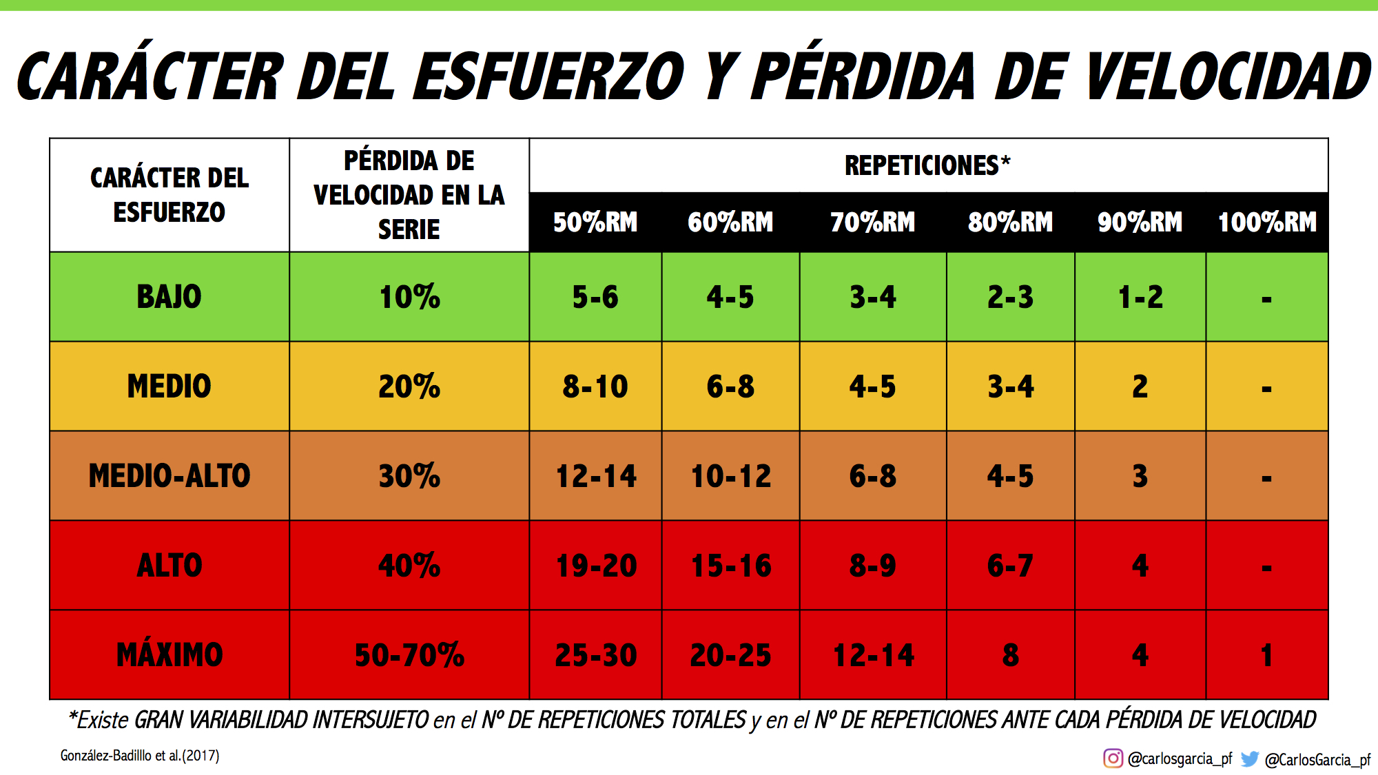 En un estudio muy reciente publicado en 2017 por González-Badillo y colaboradores, comprobaron que existe una gran variabilidad intersujeto en el número de repeticiones totales que se pueden hacer en una serie ante los diferentes %1RM y también existe una gran variación en el número de repeticiones realizadas ante una misma pérdida de velocidad en la serie.