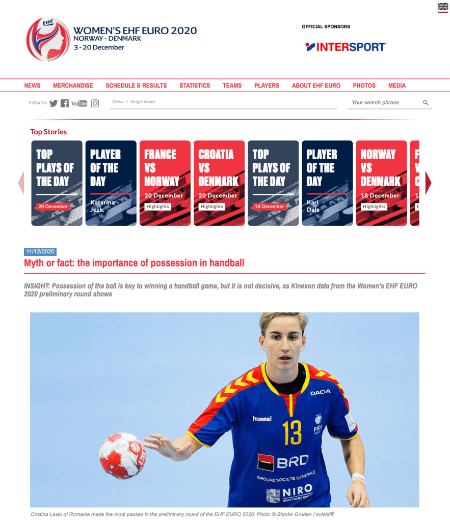 Recientemente, en el pasado Campeonato de Europa de Balonmano Femenino celebrado en diciembre de 2020, hemos visto como la Federación Europea de Balonmano (EHF), a través de la empresa de «tracking» Kinexon, nos aportaba numerosas estadísticas de cada encuentro. Al finalizar la ronda preliminar, uno de los periodistas de la EHF escribía un artículo titulado «Myth or fact: the importance of possession in handball», en este escrito se realizaba un interesante análisis sobre la relación entre el tiempo de posesión y el número de goles logrados por cada selección.