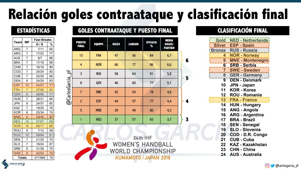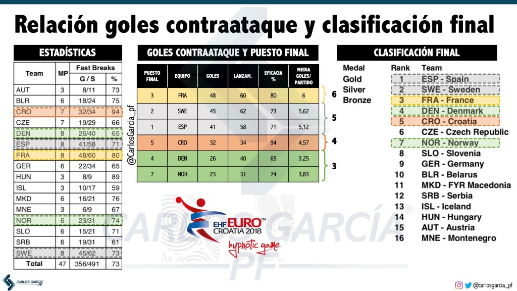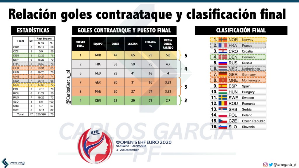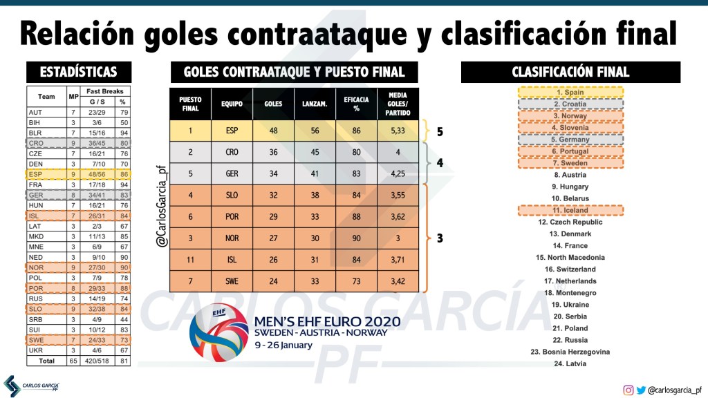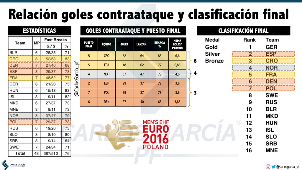 Si observamos las estadísticas de los últimos Campeonatos de Europa y Campeonatos del Mundo de Balonmano Masculino podemos ver que existe una relación entre el número de goles logrados en contraataque y el puesto obtenido en la clasificación final, de modo que los equipos que logran mayor número de goles en esta fase del juego obtienen una mejor clasificación al final del torneo. En las siguientes imágenes se pueden observar estos datos.