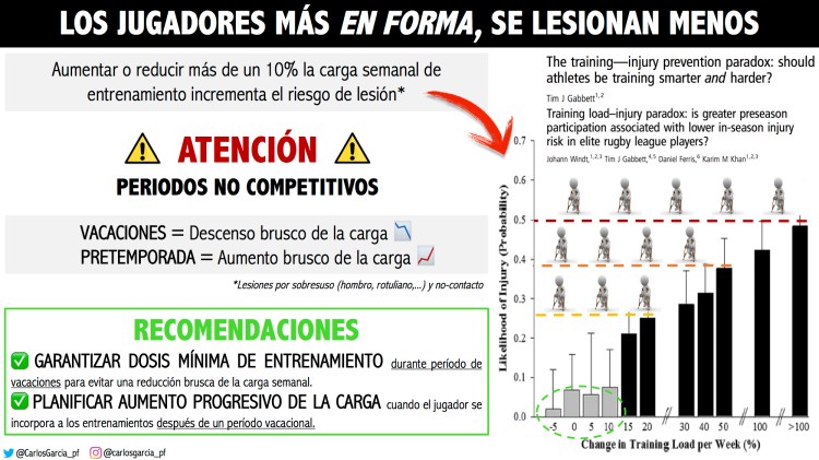 En este sentido, debemos apoyarnos en la literatura científica sobre el control de la carga de entrenamiento (Gabbett, 2004, 2016; y Gabbett et al., 2017). Estos estudios nos indican que debemos poner especial atención a la pretemporada, ya que habitualmente se pasa de una fase de carga muy baja (período vacacional) a uno de los momentos de más carga del año (pretemporada). Por tanto, sometemos al deportista a las mayores exigencias cuando peor es su nivel de condición física. ¿No parece muy lógico, verdad?