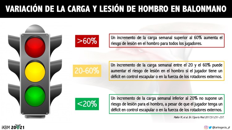En el caso del balonmano, un estudio reciente (Møller et al., 2017) ha demostrado que existe una relación entre el aumento brusco de la carga semanal y las lesiones de hombro en jugadores de balonmano. Este estudio estableció diferentes umbrales para determinar el riesgo de lesión, como puede verse en las siguientes imágenes.
