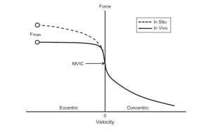 Relación fuerza-velocidad en contracciones excéntricas y concéntricas en el músculo esquelético (Extraído de Meylan et al. [1]).