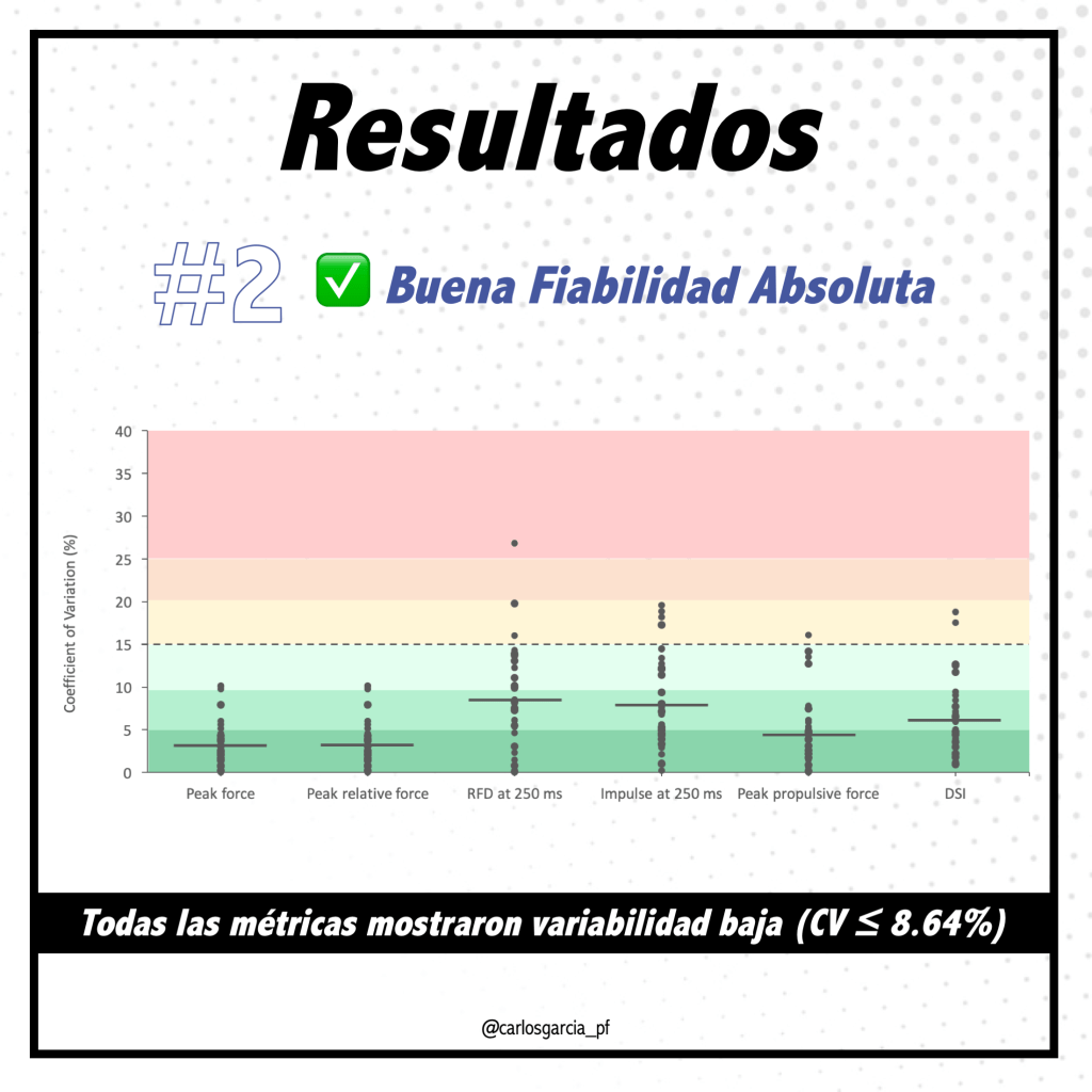 Los resultados mostraron un rango de coeficientes de correlación intraclase (ICC) entre 0.78 y 0.97, lo que indica que tanto el DSI como sus componentes (IMTP y CMJ) son altamente reproducibles entre mediciones.