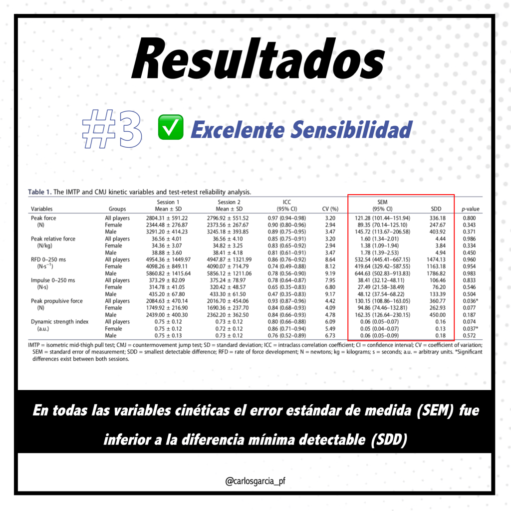El error estándar de medición (SEM) fue inferior a la diferencia mínima detectable (SDD), lo que demuestra que el DSI es suficientemente sensible para identificar cambios reales y significativos en el rendimiento, incluso en progresiones pequeñas.