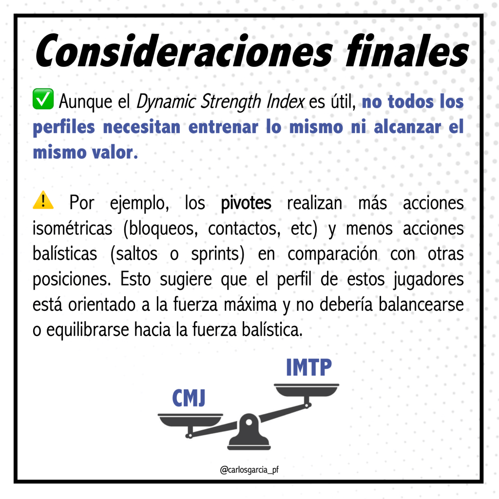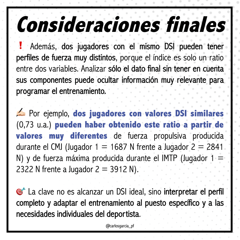 1. No entrenes para alcanzar un valor “ideal” de DSI. Entrena para lo que necesita el deportista según su posición de juego, su perfil neuromuscular y su experiencia en el entrenamiento de fuerza.